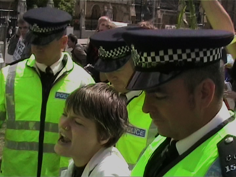 Police arrest demonstrators opposing protest restrictions around parliament on the Mass Act of Defiance protest, London, UK. 07/08/2005.