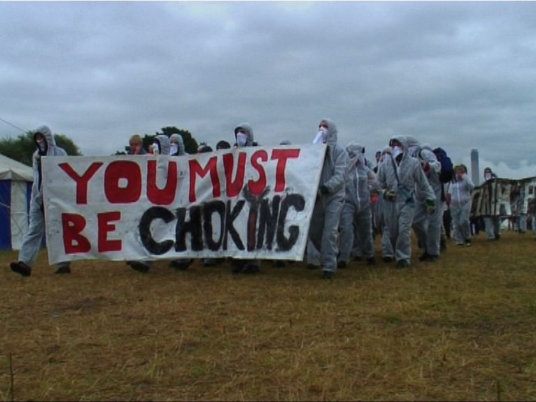 Hundreds of protestors leave the Climate Camp and trek across the Yorkshire countryside in an attempt to breach security fences around the Drax power station, Selby, UK. 01/09/2006.