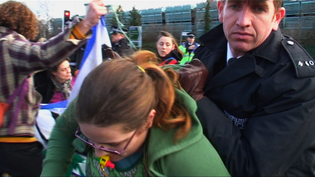 Police use force against No Borders protestors marching along a road outside Harmondsworth Immigration Detention Centre, London, UK. 10/02/2007.