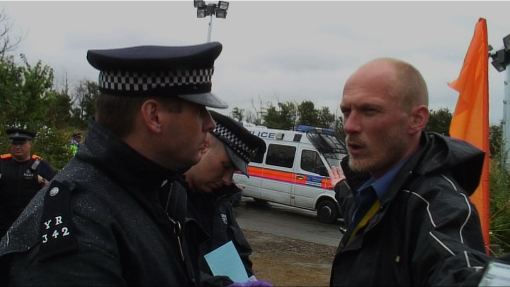 Police search journalists entering the Kingsnorth Climate Camp, Hoo, UK. 05/08/2008.