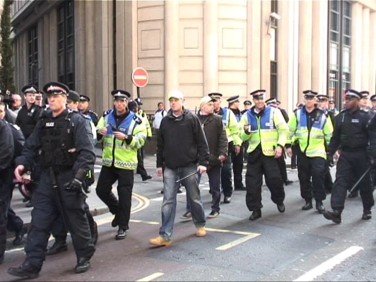 Plain clothes police wielding batons appear from a police line after officers clash with protestors leaving the Ian Tomlinson protest on the second day of the G20 summit, London, UK. 02/04/2009.