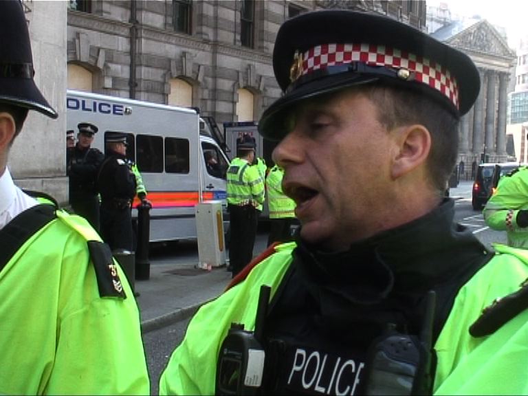 A police inspector threatens journalists with arrest under Section 14 of the Public Order Act at G20 protests marking the death of newspaper seller Ian Tomlinson, who died after being struck by a riot police officer, London, UK. 02/04/2009.