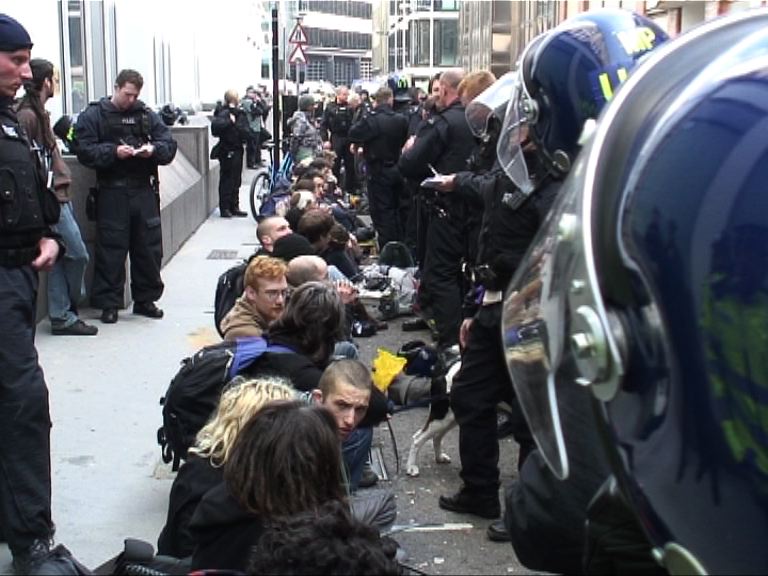 Riot police process protestors after raiding a squatted convergence centre for G20 protestors at Earl Street, London, UK. 02/04/2009.