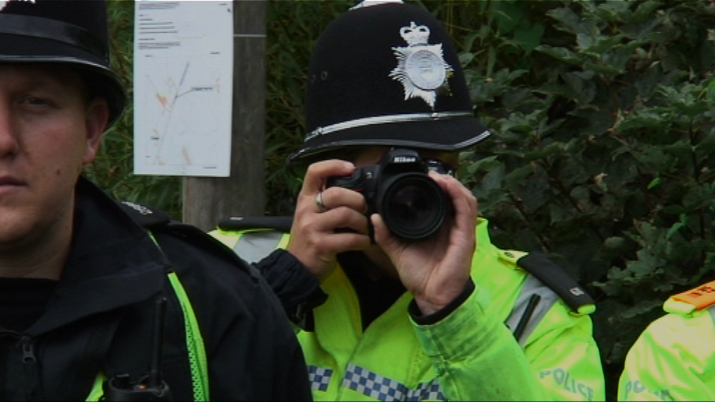 Police evidence gathering teams are caught putting journalists under surveillance at an anti-British National Party (BNP) protest, Codnor, Derbyshire, UK. 15/08/2009.