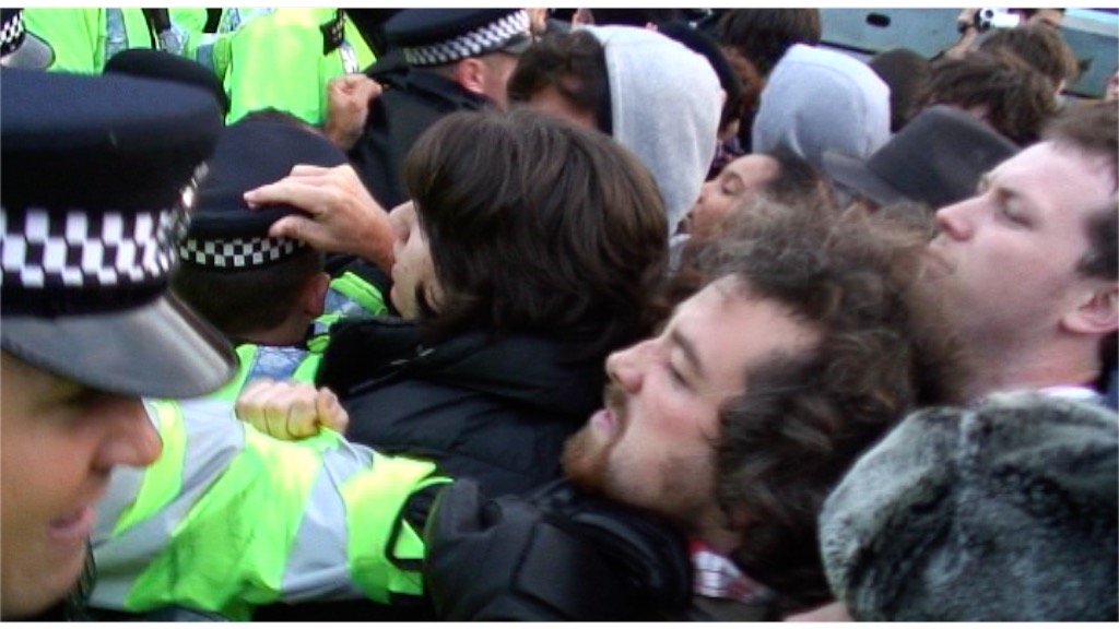 Police use force to push back protestors after Unite Against Fascism (UAF) activist Martin Smith is arrested at a protest opposing the invitation of British National Party (BNP) leader Nick Griffin to join the panel on the BBC Question Time current affairs program, London, UK. 22/10/2009.