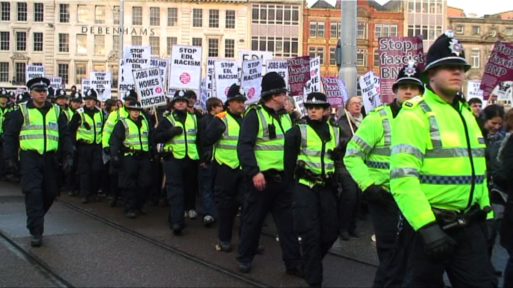 Anti-fascist protestors gather to oppose an English Defence League protest, Nottingham, UK. 05/12/2009.