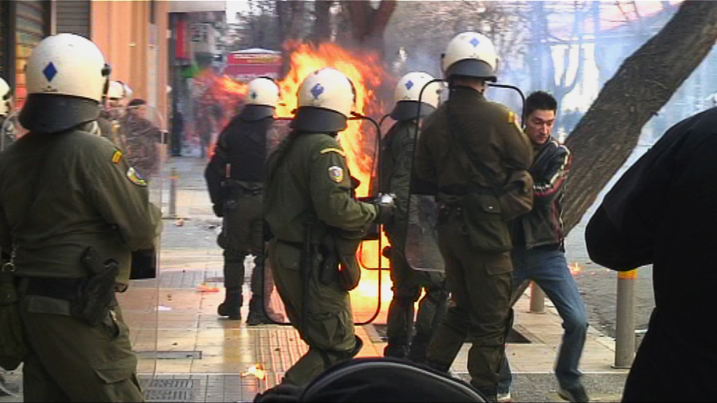 Tear gas, shock grenades and petrol bombs fly in clashes during the general strike, Athens, Greece. 11/03/2010.