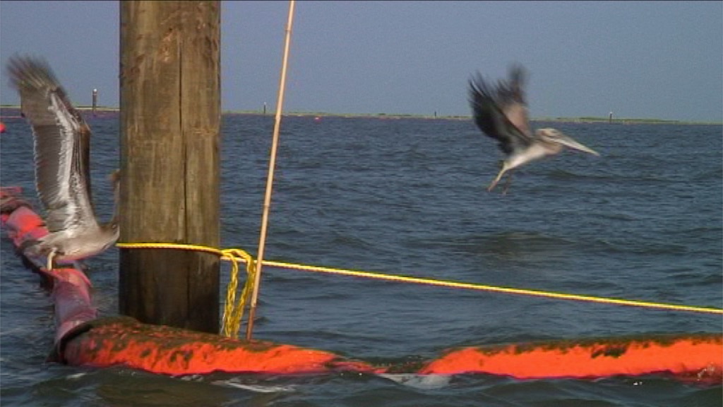 Pelicans take flight from oil covered protective orange booms after the Deepwater Horizon oil spill in the Gulf of Mexico, Grand Isle, USA. 10/08/2010.