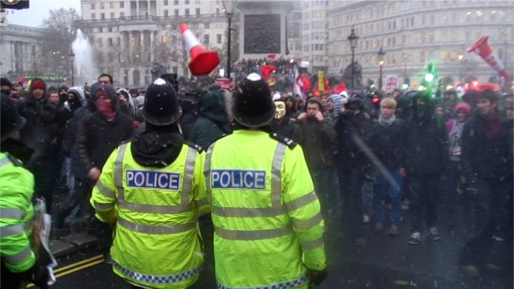 Riot police use batons on student protestors after traffic cones are thrown at officers and several masked men attack police vans and try to encourage others to join in, London, UK. 30/11/2010.