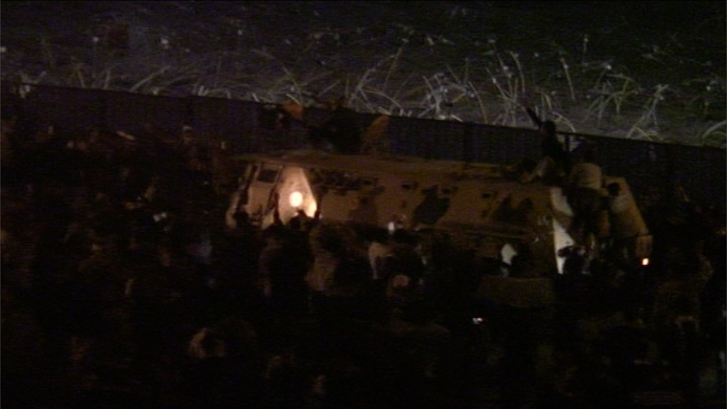 CAIRO, EGYPT – JANUARY 28: An armoured vehicle breaches Tahrir Square barricades as the military arrive in a truck and an ambulance is attacked, suspected to delivering more ammunition to the security forces, on 28 January 2011 in Cairo, Egypt.