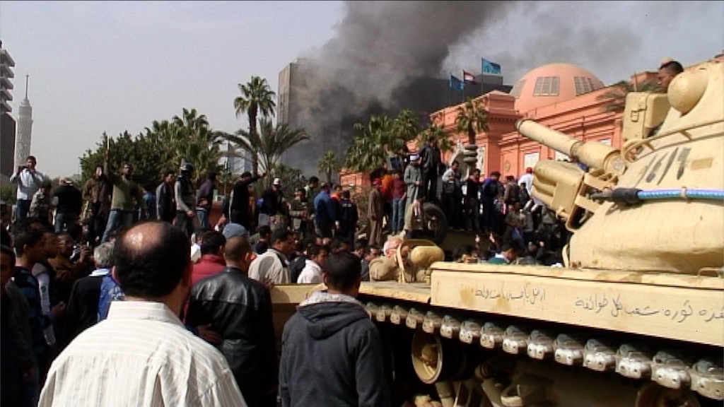 CAIRO, EGYPT – JANUARY 29: The headquarters of President Hosni Mubarak’s National Democratic Party continues to burn as protestors gather in Tahrir Square for a second day on January 29, 2011 in Cairo, Egypt.