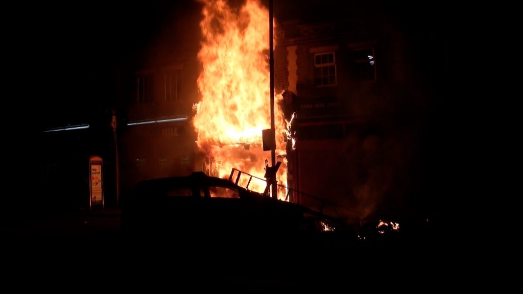 Buildings and cars burn as police cordon off Tottenham High Road at the start of rioting, London, UK. 06/08/2011.