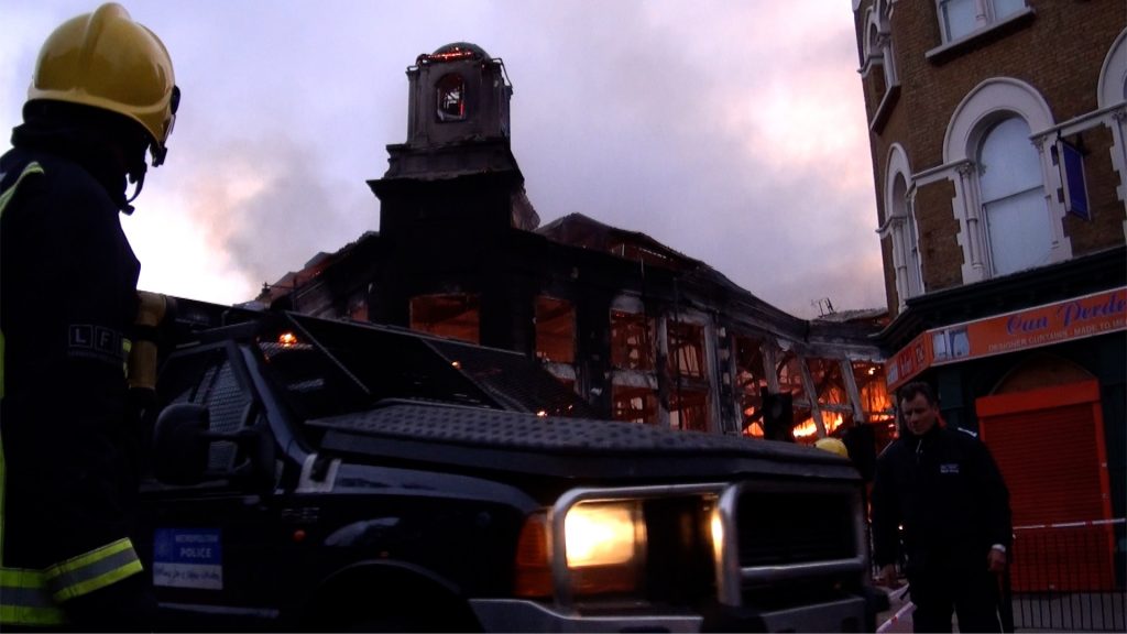 Metropolitan police armoured bomb-proof Ford F450 Jankel trucks pass in front of the burning Carpetright store and patrol Tottenham High Road during the riots, London, UK. 07/08/2011.