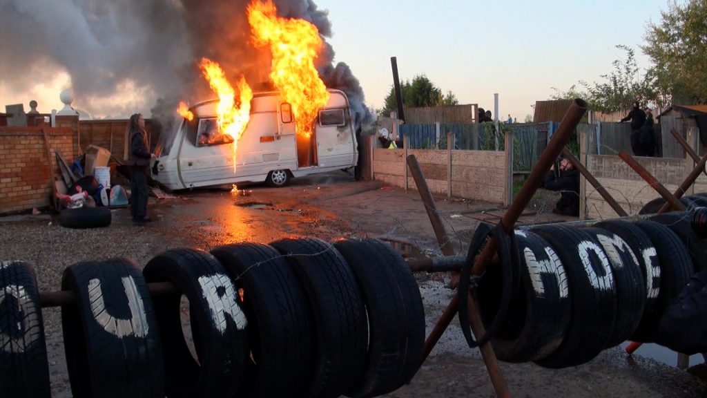 A caravan is used as a burning barricade during the Dale Farm Irish Traveller site eviction, Basildon, UK. 19/10/2011.