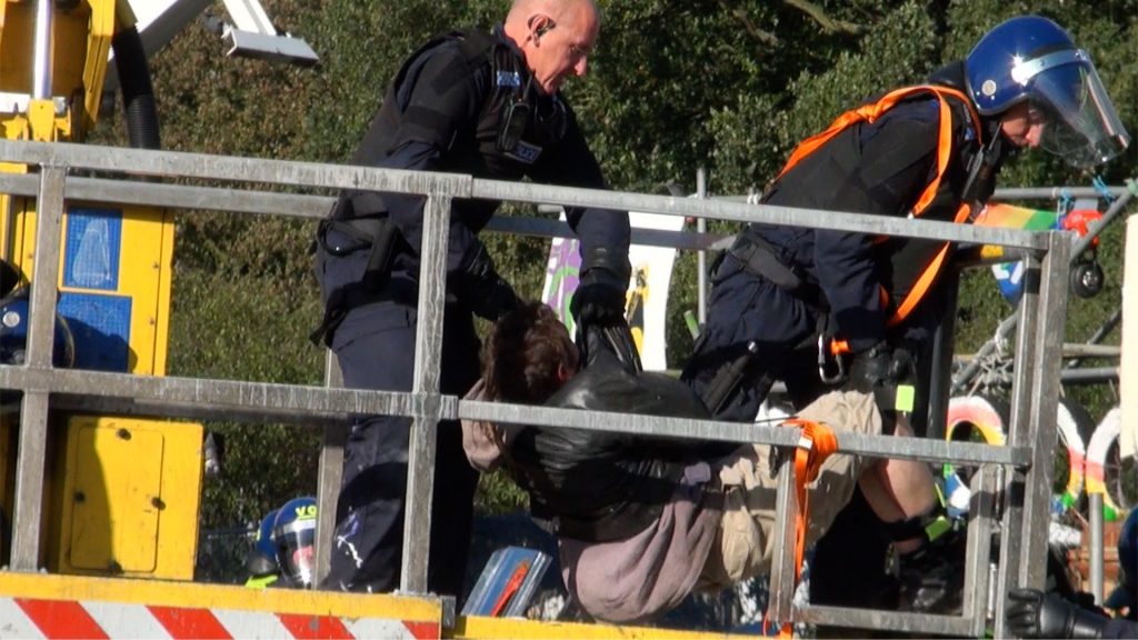 Riot police use a cherrypicker to remove activists from the scaffolding structure at the front gate of the Dale Farm Irish Traveller site during the eviction, Basildon, UK. 19/10/2011.