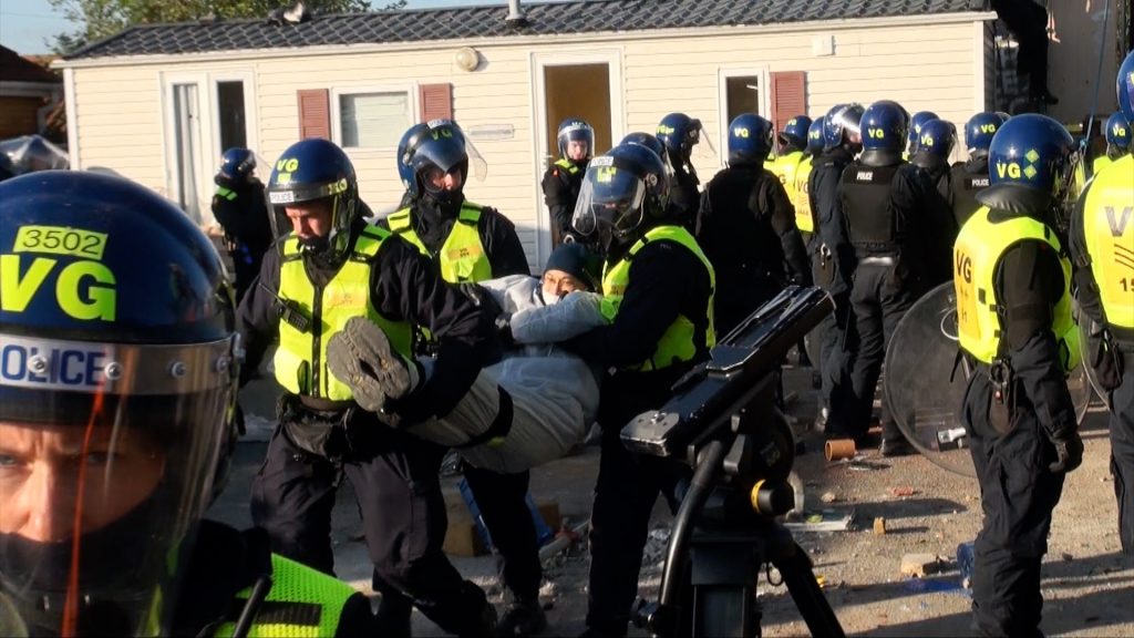 Riot Police remove activists from a caravan roof and carry one away during the Dale Farm Irish Traveller site eviction, Basildon, UK. 19/10/2011.