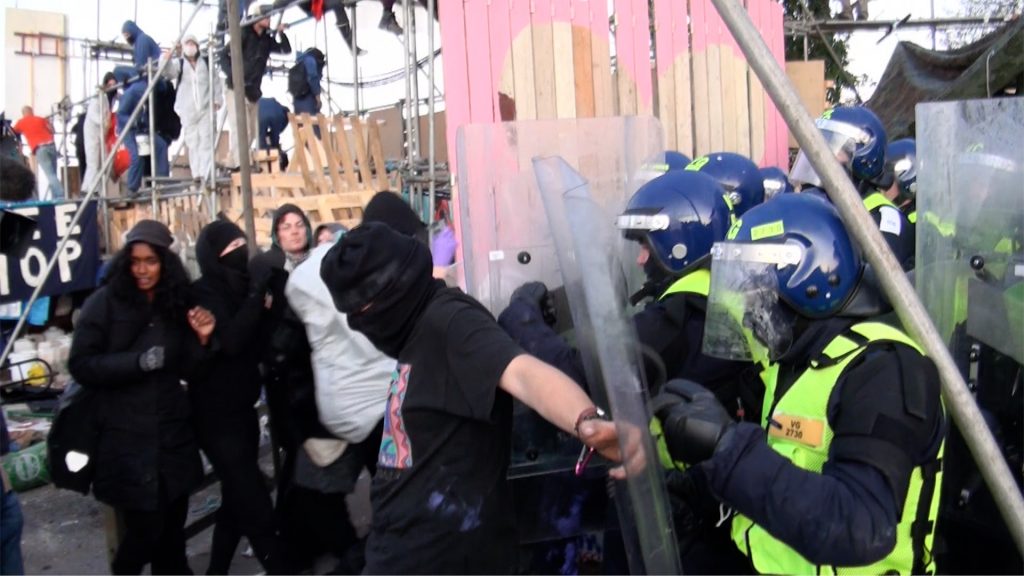 Riot police charge forwards and use an axe to break through a fence while seizing the front gate during the Dale Farm Irish Traveller site eviction, Basildon, UK. 19/10/2011.