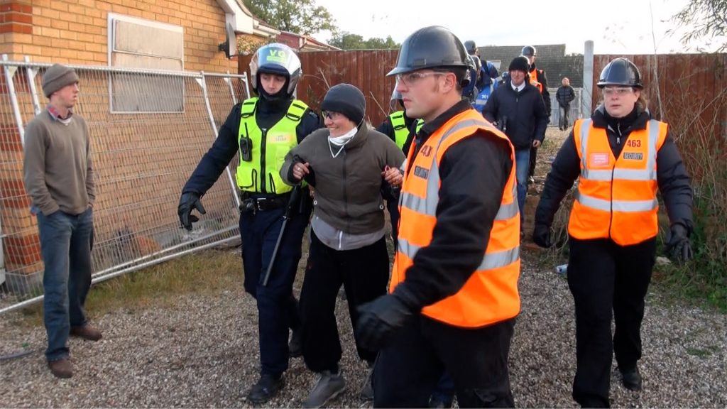 Lock-on protestors are cut out by specialist teams and led away by bailiff security and riot police to be arrested on the second day of the Dale Farm Irish Traveller site eviction, Basildon, UK. 20/10/2011.