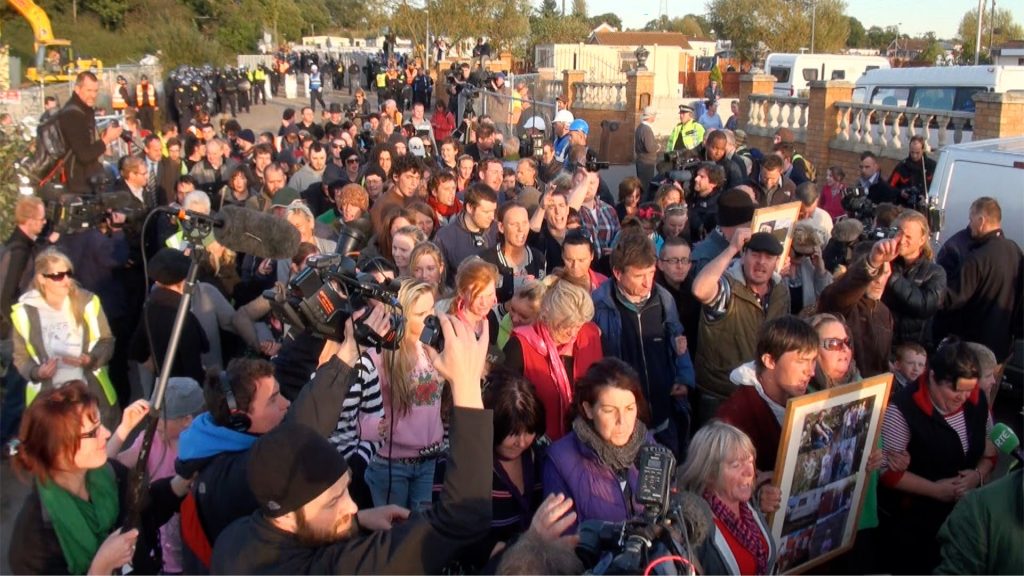 Residents of the Dale Farm Irish Traveller site escort activists as they leave to protect them from arrest by riot police on the second day of eviction, Basildon, UK. 20/10/2011.