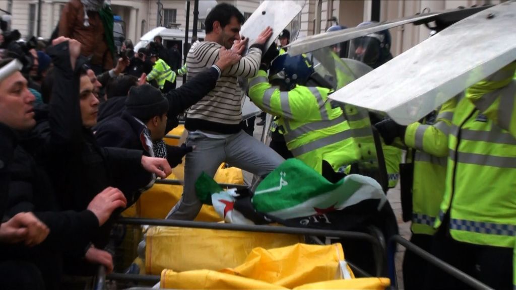 Anti-regime protestors throw paint, smash windows and clash with riot police at the Syrian Embassy, London, UK. 04/02/2012.