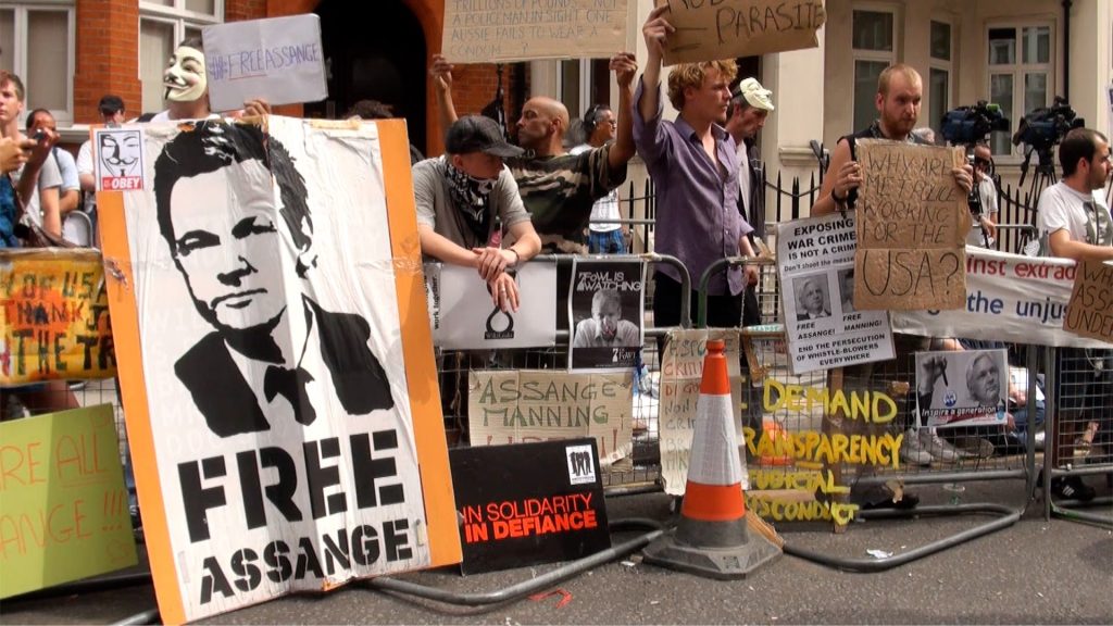 Protestors gather outside the Ecuador Embassy to support Wikileaks founder Julian Assange who sought political asylum while facing allegations of sexual assault in Sweden, London, UK. 26/08/2012.
