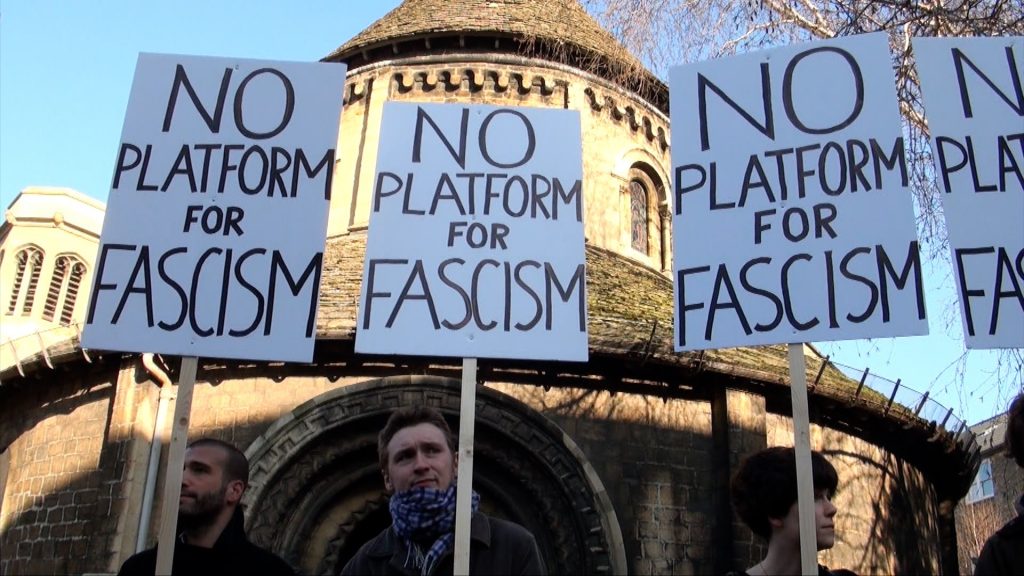 Anti-fascist protestors great French far right leader Marine Le Pen Union Society debate, Cambridge, UK. 19/02/2018.