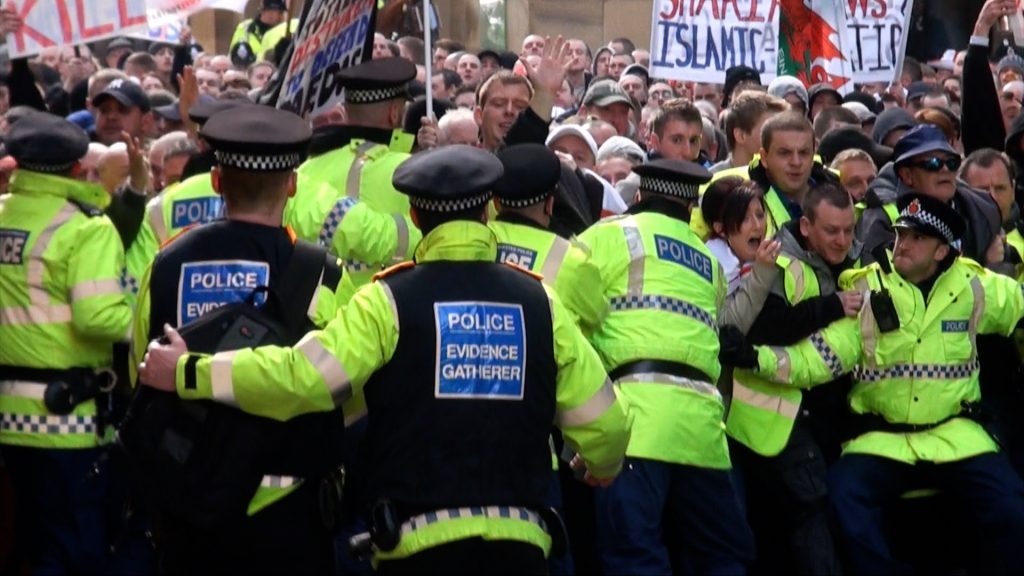 Riot police deal with clashes and make arrests as hundreds join a far right English Defence League (EDL) protest, Manchester, UK. 02/03/2019.