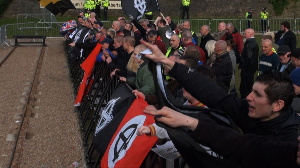 Far right protestors attending White Pride Worldwide Day threaten and assault members of the press, Swansea, Wales. 09/03/13.