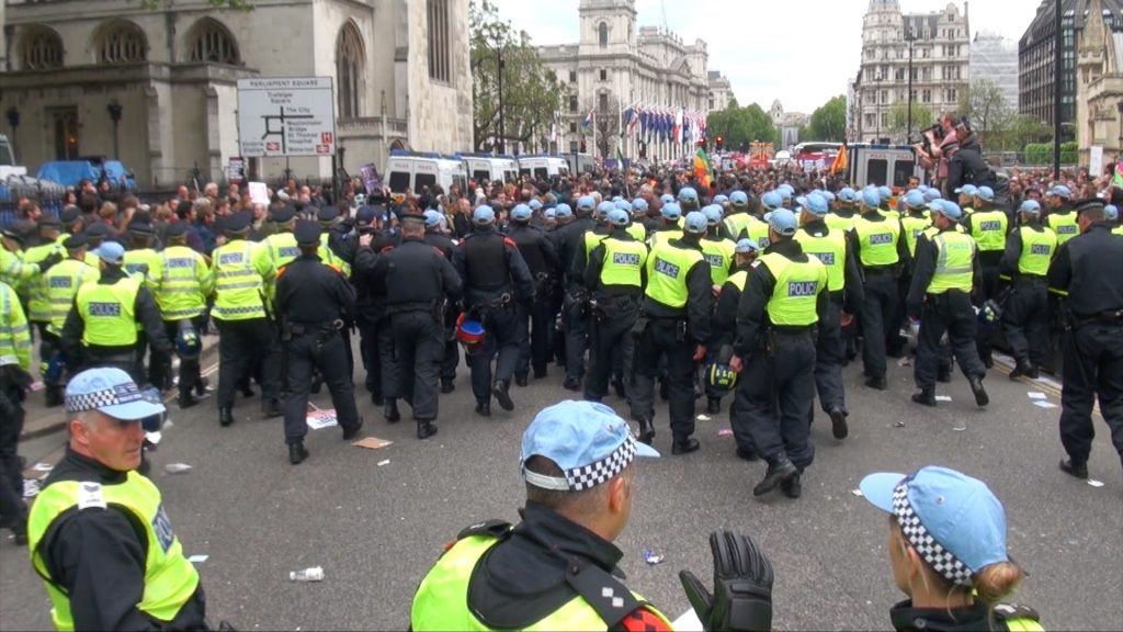 Large numbers of police use force to push back anti-fascists blocking the road outside parliament to halt a march by the British National Party, injuring one protestor, before making a large number of arrests, London, UK. 01/06/2013.