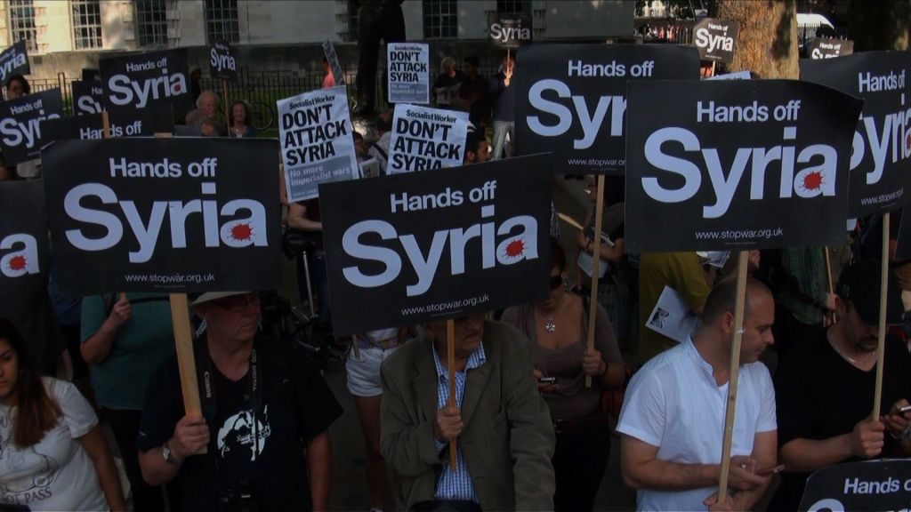 Hands Off Syria protestors block Whitehall for an hour in a sit-down protest and one man is arrested, London, UK. 28/08/2013.