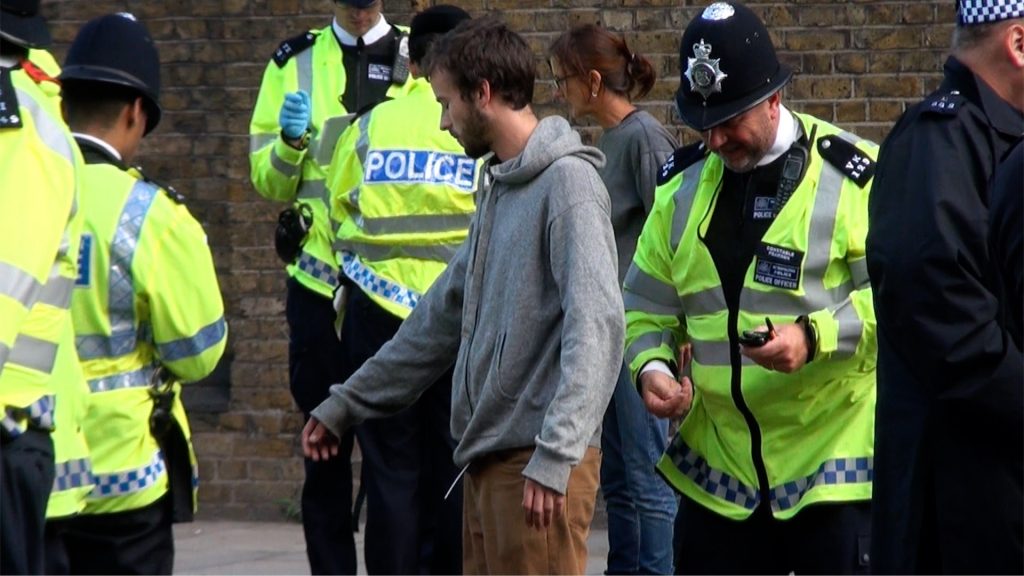 Riot police run into contain anti-fascist protestors, mass arrest them and detain them on commandeered public transport buses, London, UK. 07/09/2013.