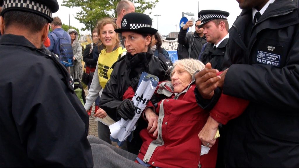 Police arrest protestors for blocking a public highway outside the Defence and Security Equipment International (DSEi) arms fair at the Excel Centre, London, UK. 08/09/2013.