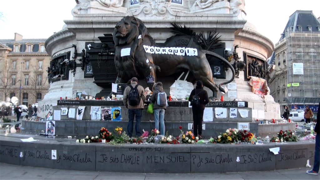 Place de la République is daubed in graffiti and candles and pens are left in memory of the 12 people killed by jihadist terrorists claiming revenge for depictions of the prophet Mohammed, Paris, France. 11/01/2015.