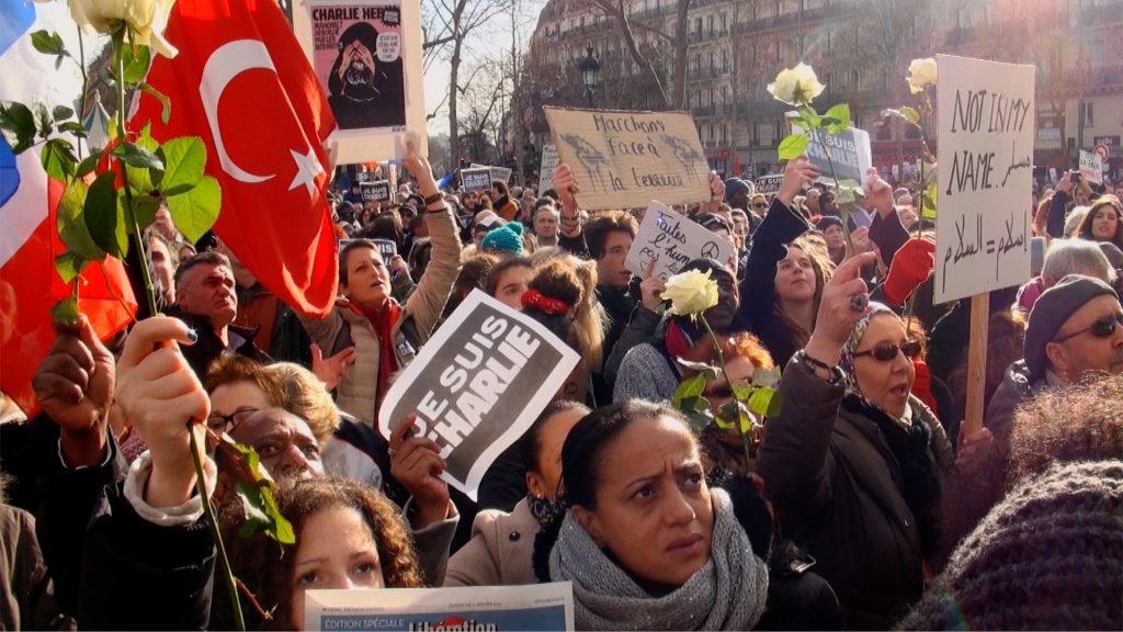 Thousands of people of all nationalities gather in Place de la République at the start of the “Je Suis Charlie” protest opposing the jihadist terrorist attack that killed 12 people at the offices of Charlie Hebdo satirical magazine, Paris, France. 11/01/2015.