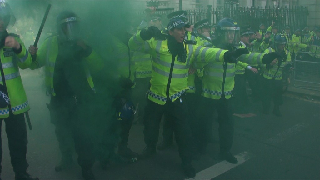 Multiple missiles and smoke flares fly as riot police clash with anti-government protestors outside Downing Street follow a Conservative Party win at the General Election, London, UK. 09/05/2015.