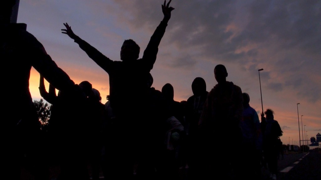 CALAIS, FRANCE – AUGUST 07: Ethiopian and Eritrean refugees living in the makeshift camp known as The Jungle target the entrance to the Eurotunnel, demanding that the border is opened on August 07, 2015 in Calais, France.