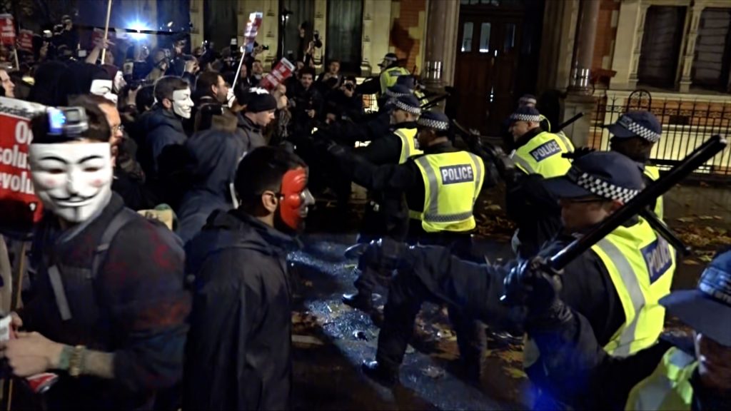 28 people are arrested after clashes break out between police and protestors on the annual Million Mask March, London, UK. 05/11/2015.