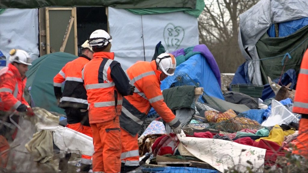 Workers in orange overalls begin dismantling the south side of the makeshift refugee camp known as the Jungle, Calais, France. 09/02/2016.