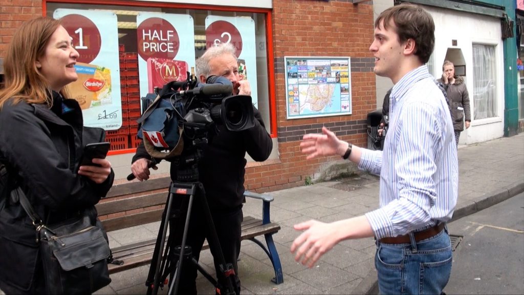 The UKIP press officer attempts to stop the press from filming outside the party offices, claiming the cameras are scaring away supporters, Ramsgate, UK. 02/05/2015.