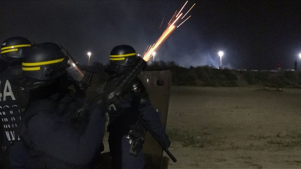 Riot police clash with refugees on the eve of the makeshift Jungle refugee camp eviction, Calais, France. 23/10/2016.