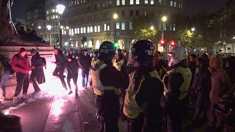 Riot police arrest 53 people after protestors hurled fireworks, bottles and cans on the several thousand strong annual Million Mask March London, UK. 05/11/2016.