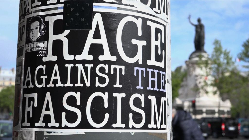 Anti Le Pen graffiti and stickers around Place de la Republique on May Day protestors gathering. Paris, France. 01/05/2017.