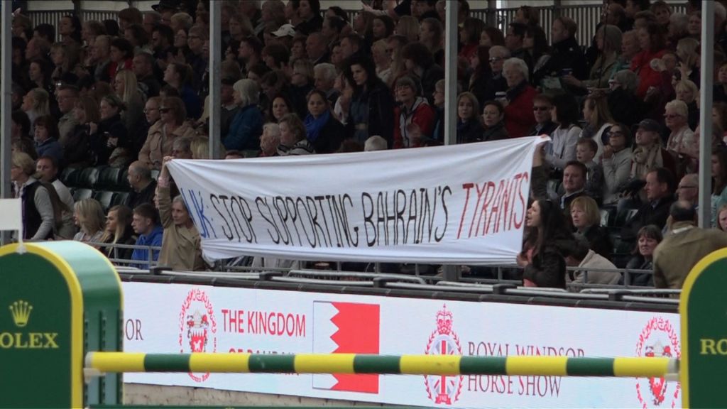 Human rights activists unfurl a banner saying, “UK Stop Supporting Bahrain’s Tyrants” during the Bahrain Kings Cup at the Royal Horse Show. Windsor, UK. 13/05/2017.