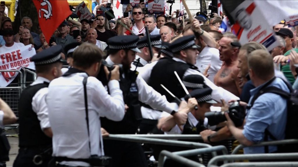 Protestors attack police and brake through security fences protecting Downing Street during a protest calling for the release from prison of former English Defence League leader Tommy Robinson, real name Stephen Yaxley Lennon, London, UK. 09/06/2018.