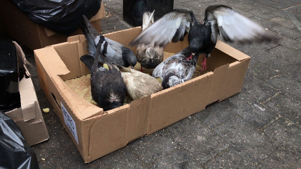 A group of pigeons hop into a cardboard box next to black trash bags in the roadside gutter and feed on breadcrumbs, London, UK. 15/06/2018.