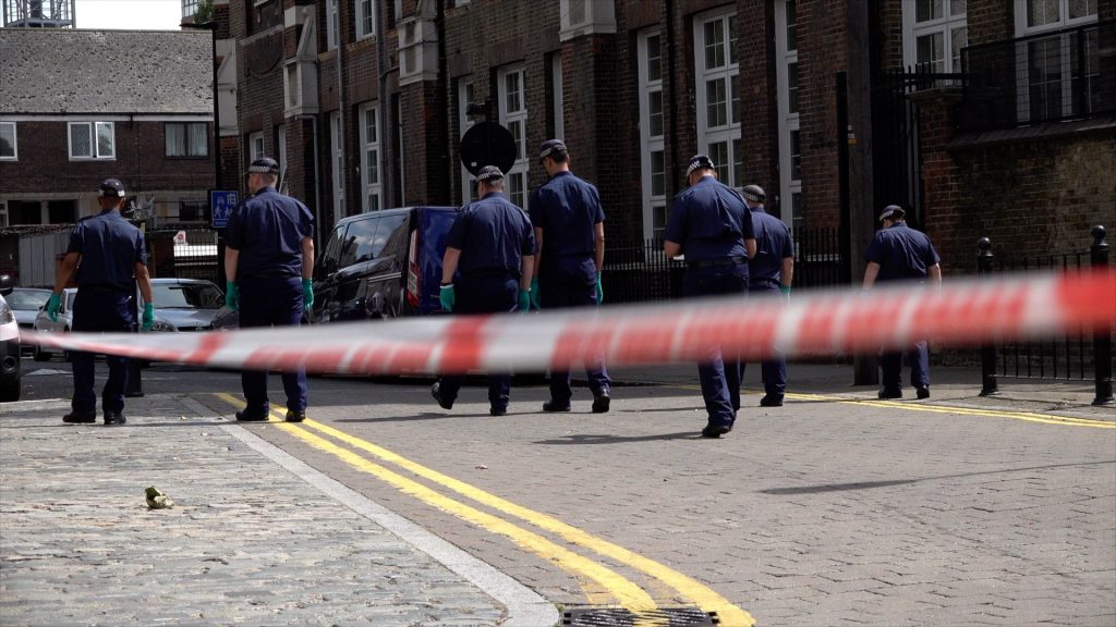 Police officers set up a crime scene cordon after a 15-year-old boy was stabbed outside his home on Knapp Road in E3 Tower Hamlets district, London, UK. 03/08/2018.