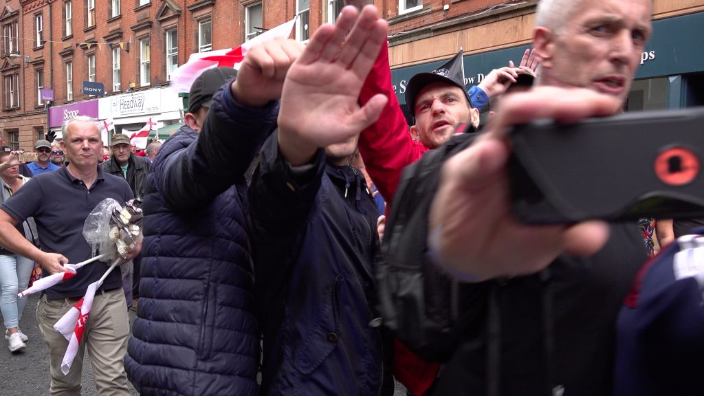 Supporters of the far right English Defence League (EDL) hurled threats and lashed out at members of the press with a flag pole during a protest that saw police attempting to keep EDL and anti-fascist protestors apart, Worcester, UK. 01/09/2018.