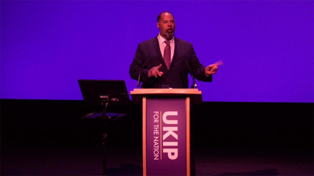 UKIP Education spokesperson David Kurten tells party conference that he has been called a “white supremacist” and a “homophobic steak of burnt gammon”, Birmingham, UK. 22/09/2018.