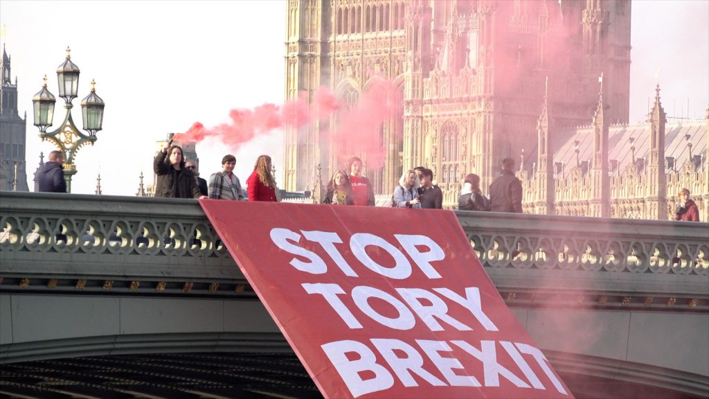 Activists from campaign group Another Europe is Possible drop a Stop Tory Brexit banner from Westminster Bridge and set of red smoke flares, London, UK. 20/10/2018.
