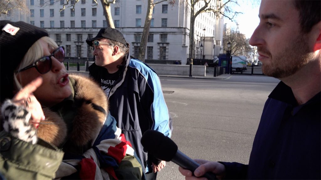 In a bizarre interview at Downing Street a Yellow Vest protestor justifies calling MP Anna Soubry a “Nazi” because she and Adolph Hitler both wanted a united Europe and accuses the press of being racist for reporting the racist comments made by the group led by James Goddard, London, UK. 08/01/2019.